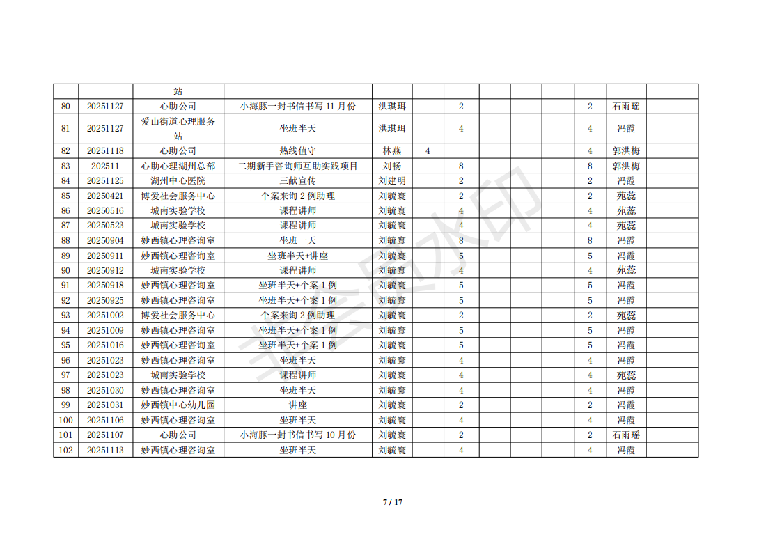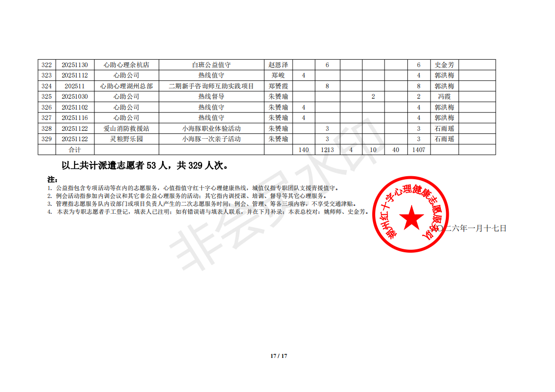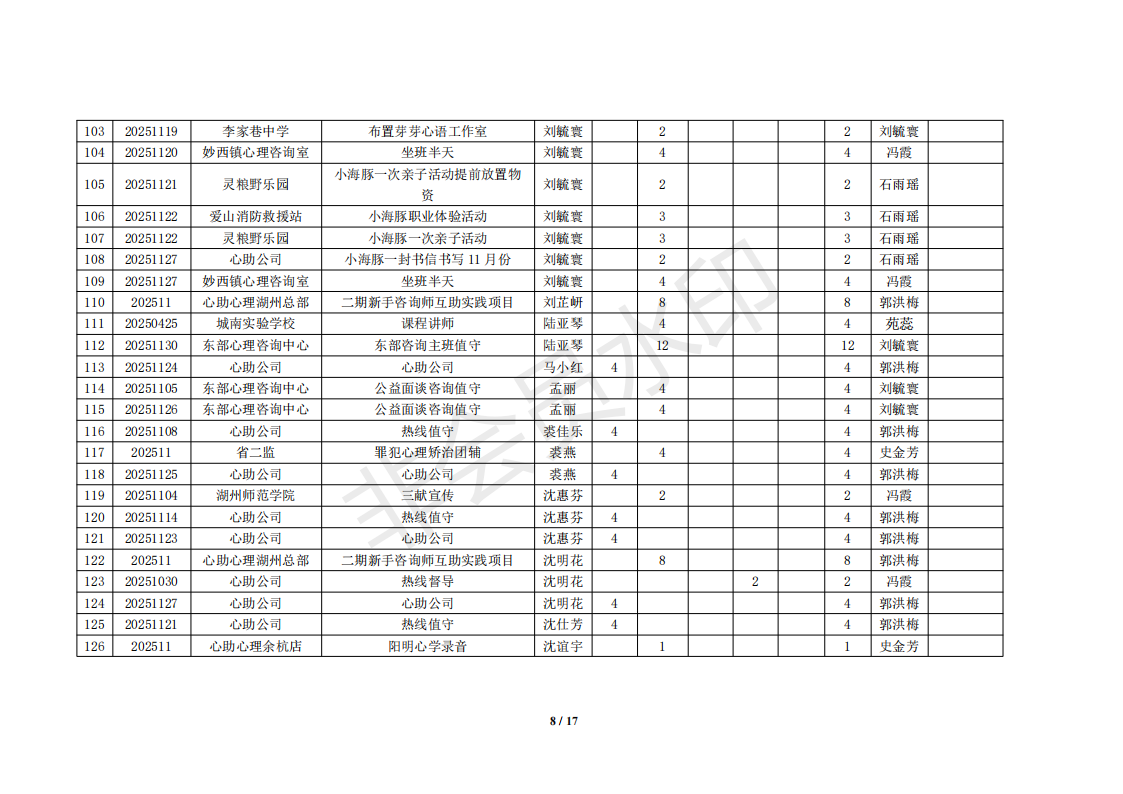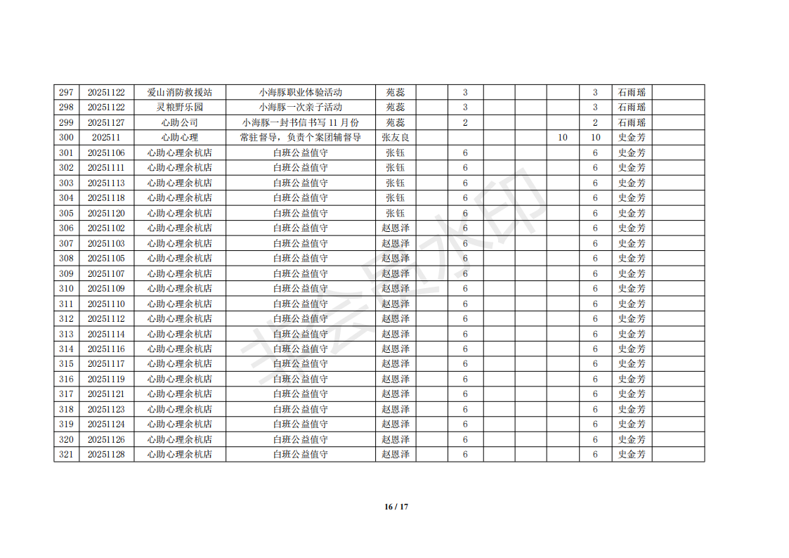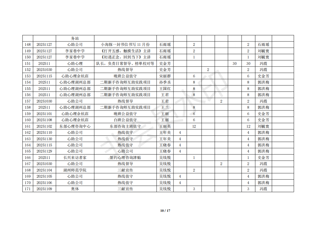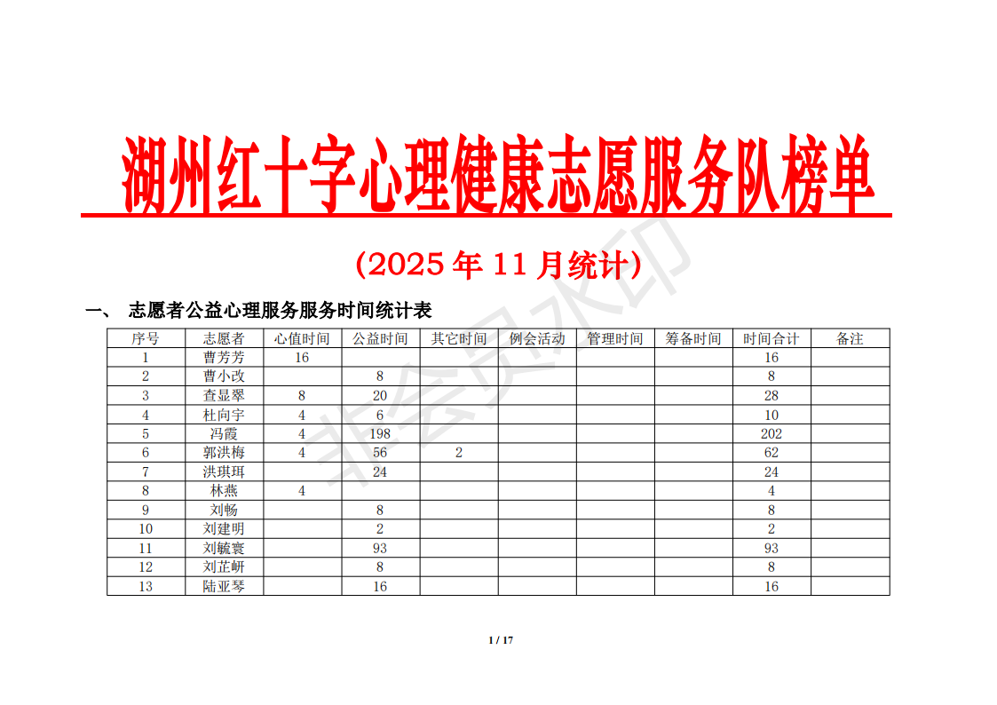 湖州红十字心理健康志愿服务队榜单11月统计