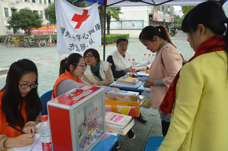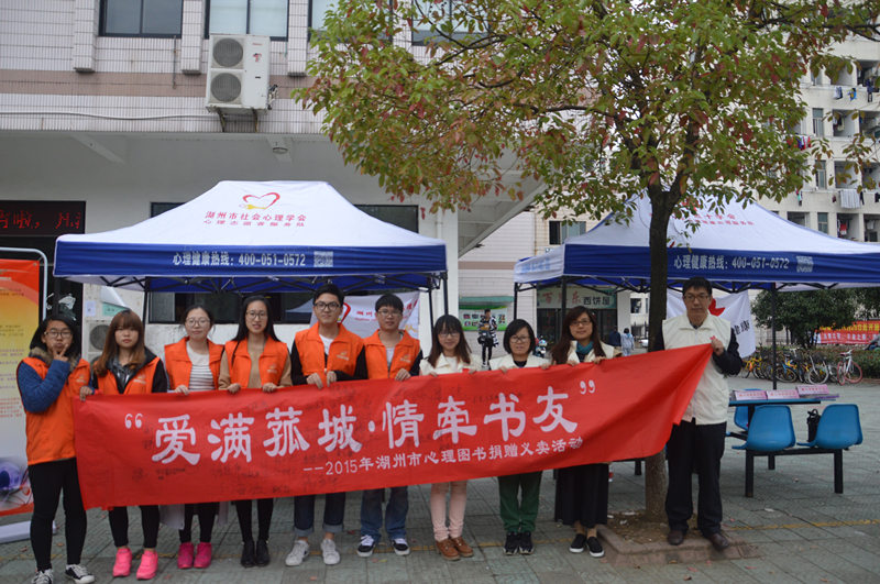 在湖州市社会心理学会倡议发起的“爱满菰城·情牵书友” ——2015年湖州市心理图书捐赠义卖活动,第一站于2015年10月31日,由湖州红十字心理健康志愿服务队和湖州市社会心理学会志愿服务队十四位志愿者共同走进湖州师范学院,以书会友,以情为系,将爱传递,让公益之路走得更宽、更远、更久。