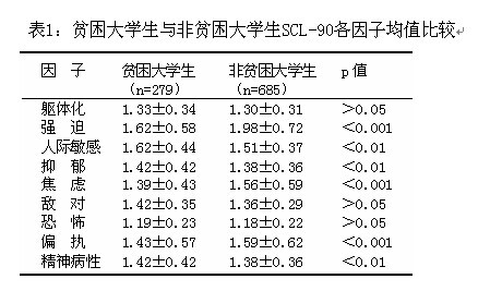 独立学院贫困大学生在人际敏感、抑郁、精神病等项目P值均小于0.01,差异有统计学意义,在强迫、焦虑和偏执等项目上存在极其显著差异。说明贫困生心理健康水平低于非贫困生,与非贫困生相比,贫困生更为敏感、自卑、抑郁、悲观。