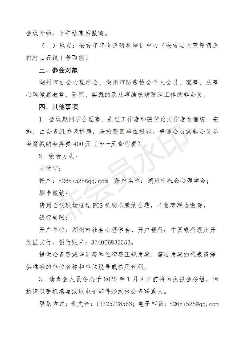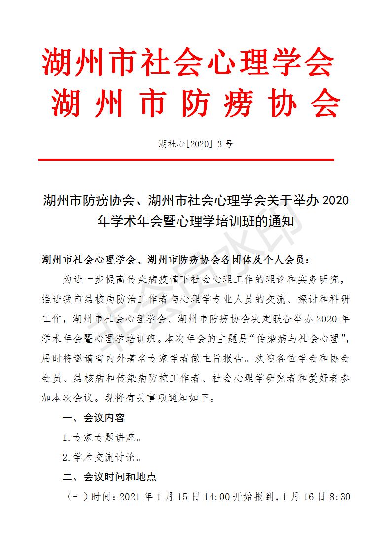 湖州市防痨协会、湖州市社会心理学会关于举办2020年学术年会暨心理学培训班的通知