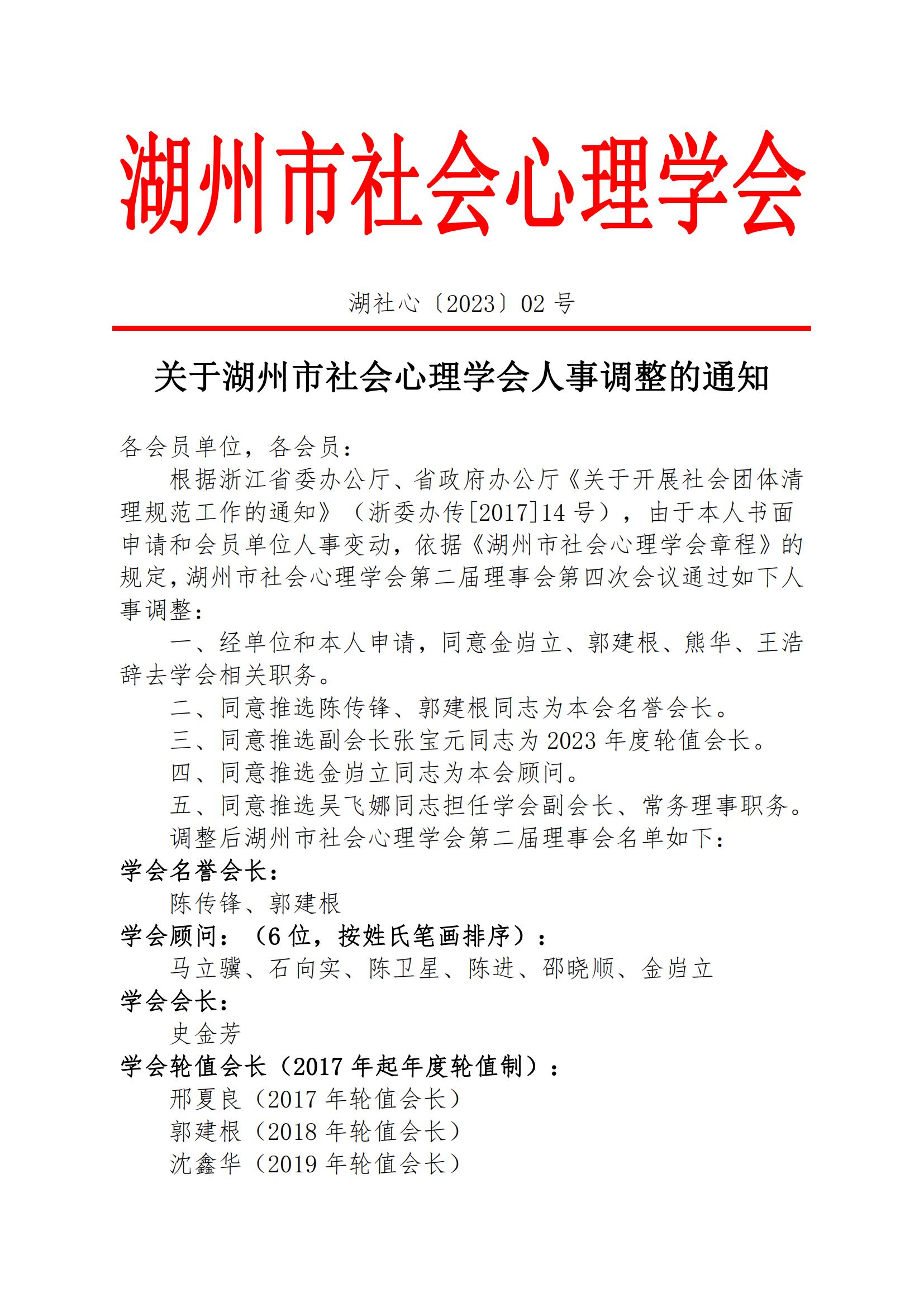 湖社心[2023]02号 关于湖州市社会心理学会人事调整的通知