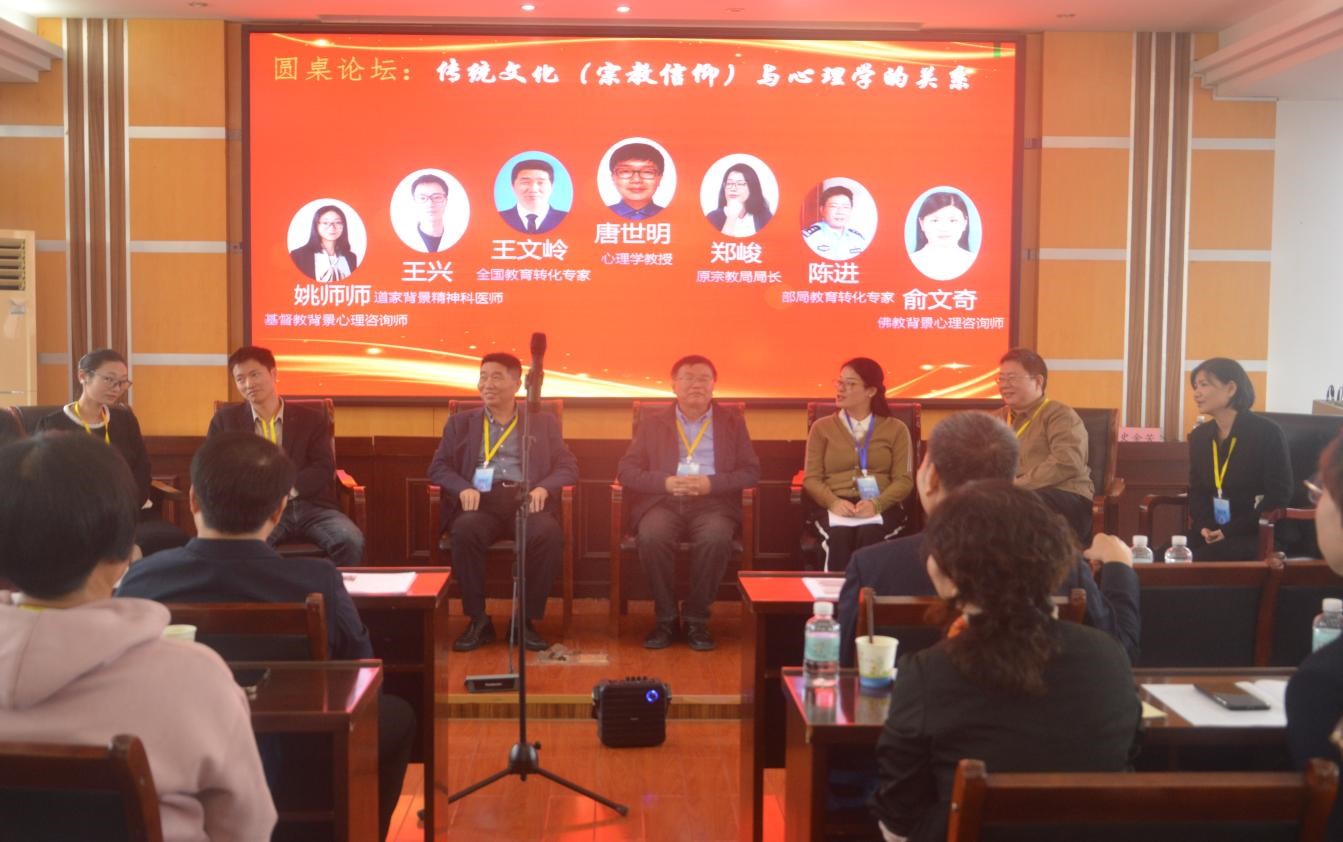 在随后开展的主旨报告上,来自杭州师范大学的教授唐世明、全国教育转化专家王文岭和湖州市社会心理学会会长史金芳三位专家,分别做了题为《从宋韵文化与身心疗愈》《中国传统文化中的心理学》《经史合参在夏令营中的运用》的精彩报告。紧接着,大会举行了“传统文化(宗教信仰)与心理学的关系”圆桌会议。圆桌论坛由史金芳会长主持,邀请了杭州师范大学唐世明教授、区政协郑峻副主席、市委政法委王文岭调研员、部局教育转化专家陈进高级警长、道家认知治疗硕士王兴医生、佛教背景俞文奇咨询师和基督教背景姚师师咨询师等七位专家学者就时下社会热点进行了讨论,并从各自的知识体系、工作经验和宗教信仰进行了现场答疑。圆桌论坛为传统文化与心理学的融合提供了新的思路和视角,引发了与会者的积极讨论。