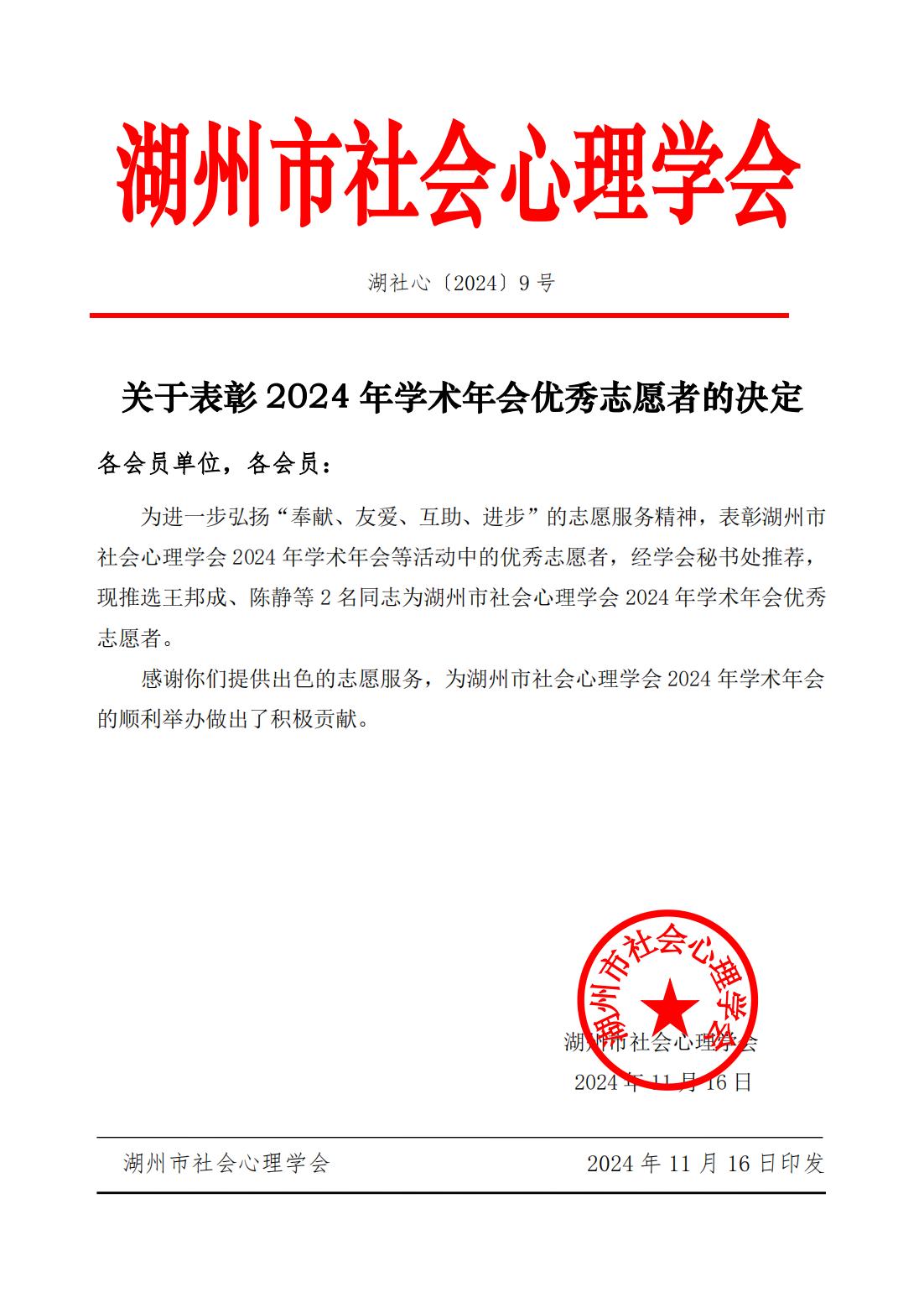 湖社心[2024]09号 关于表彰2024年学术年会优秀志愿者的决定